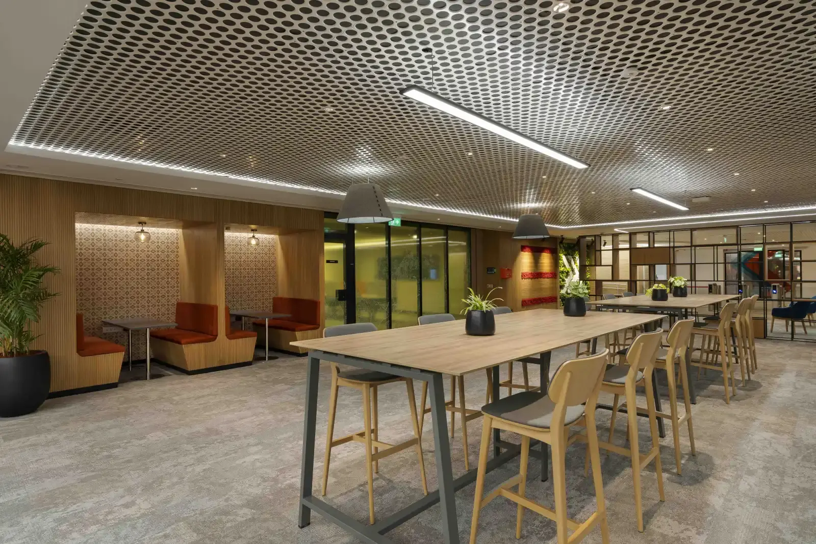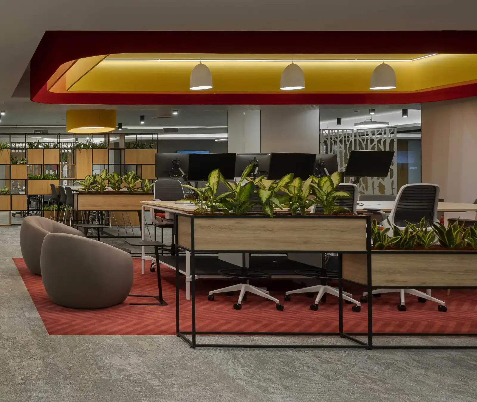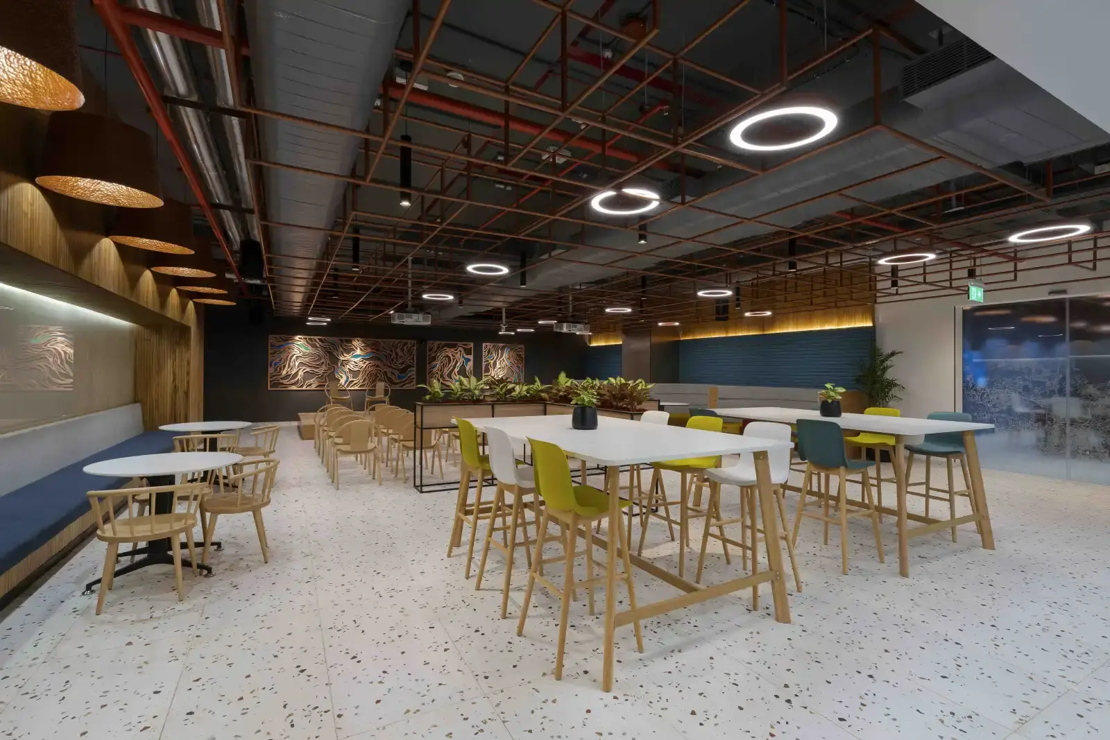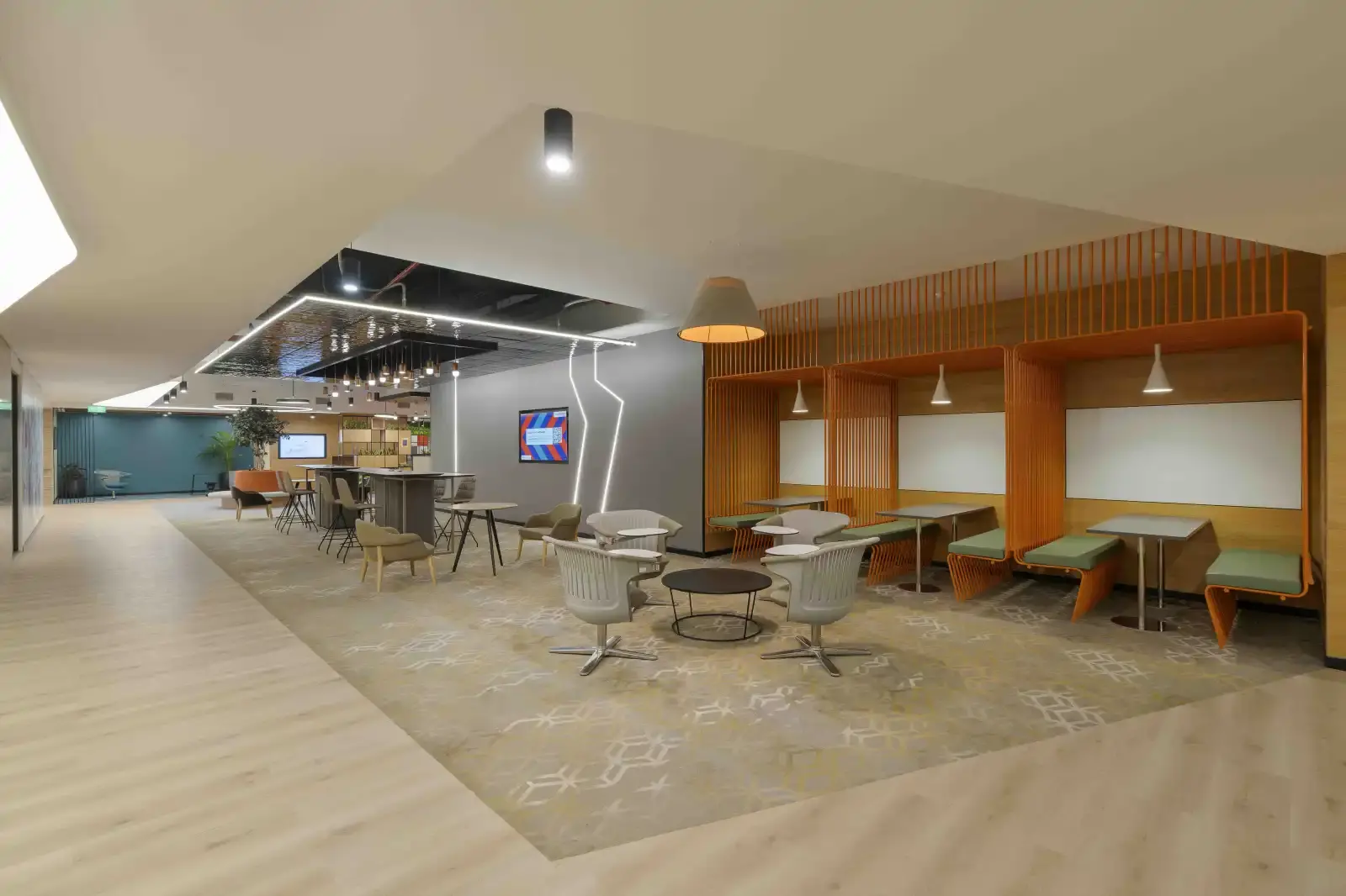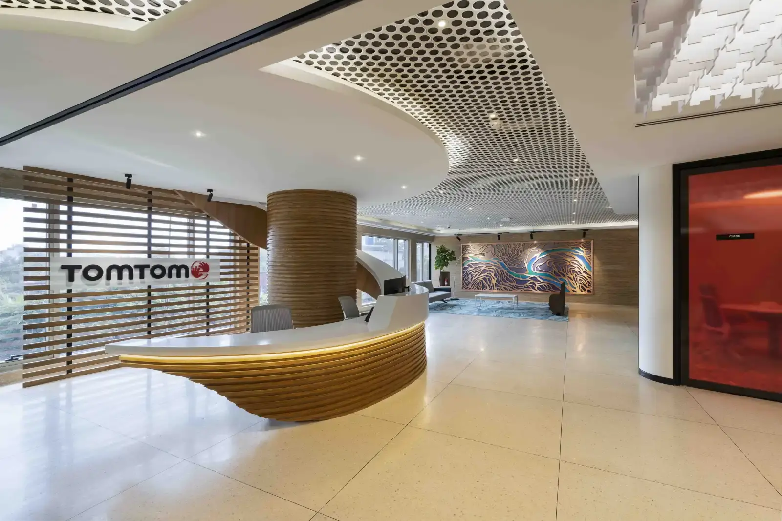 This modern workspace executed for a leading consumer electronics company spans over 1,00,000 sft. in the city of Pune. Built around activity-based working in mind, the contemporary interiors give employees a sense of utmost spaciousness. We've highlighted special areas like the reception, meeting rooms, collaborative spaces, break out spaces, and café zone. The use of fresh and vibrant colours stand out in the whole space and provide an inviting aesthetic. We are sure that everyone utilizing this space will collaborate and create the future of location technology.